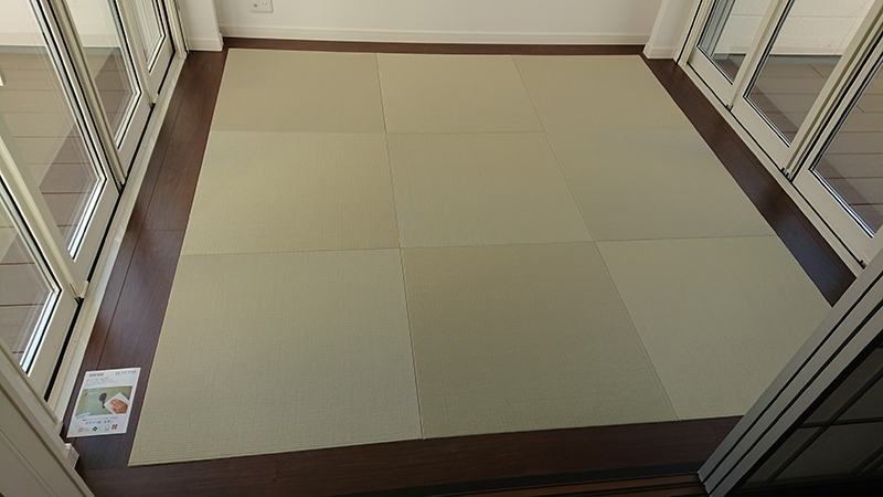 セキスイ畳表「美草目積リーフグリーン」を使用して、13ミリの薄畳・縁無畳(琉球畳)半畳9枚を、市松敷きで納品致しました。