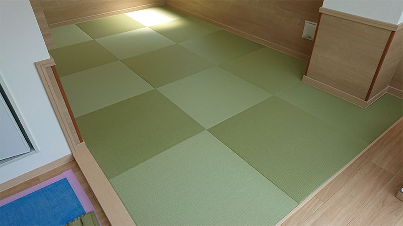 ダイケン和紙表「清流(銀白色)」を使用して、琉球畳(縁無畳)半畳15枚を市松敷きで納品致しました。