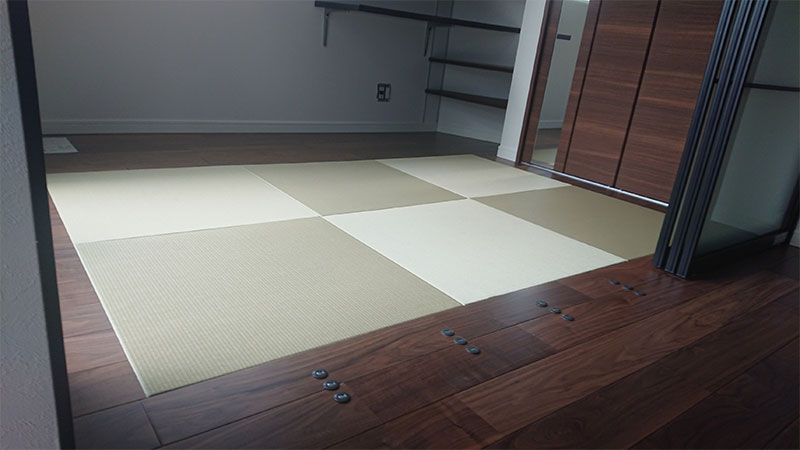 ダイケン和紙表「清流16(若草色)」とダイケン床暖房対応畳床「座スリム13Z」を使用して、琉球畳(縁無畳)半畳6枚を市松敷きで納品致しました。