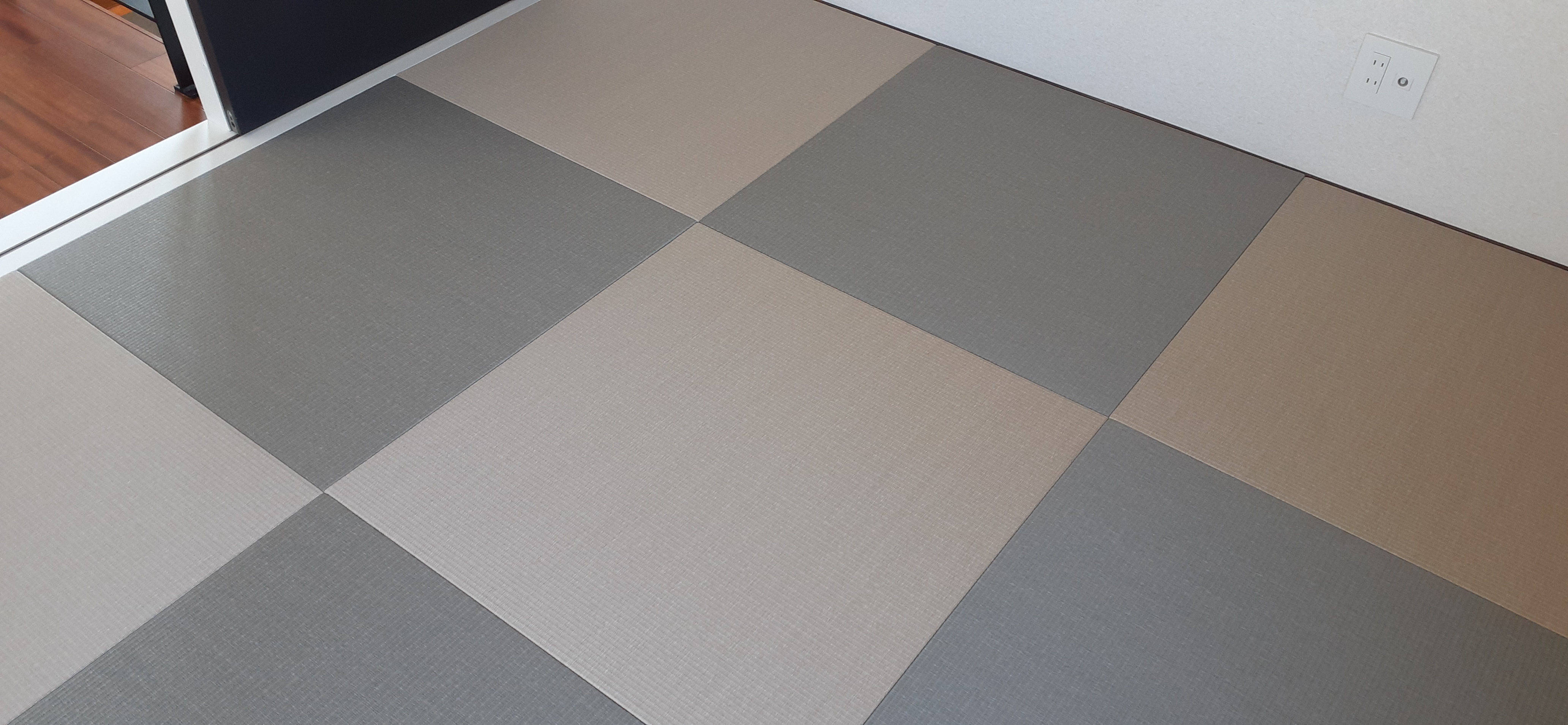 ダイケン和紙表「清流11(銀鼠色)」と「清流14(灰桜色)」の2色の畳表を使用して、琉球畳(縁無畳)半畳4枚・5枚を市松敷き  で納品いたしました。