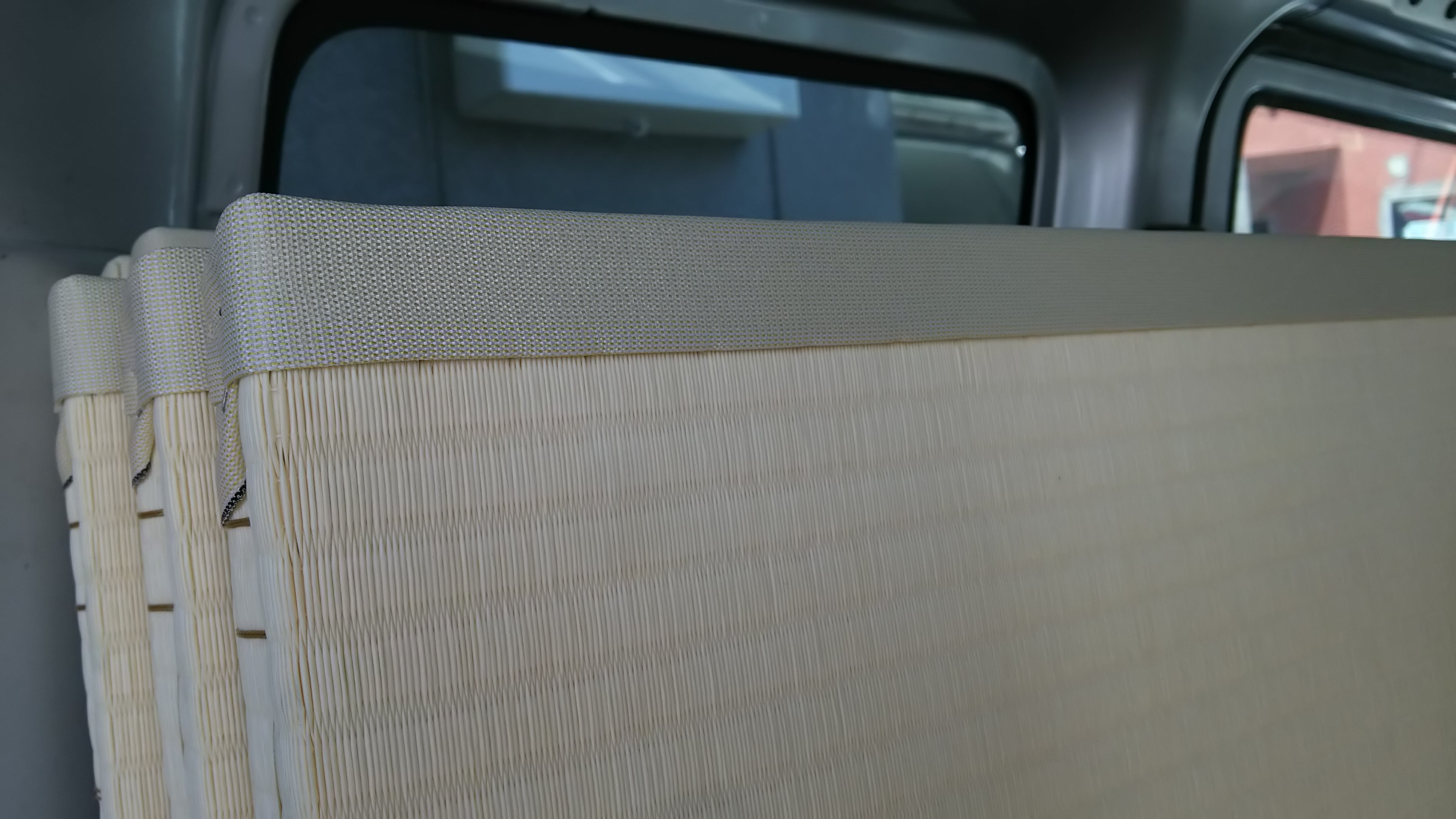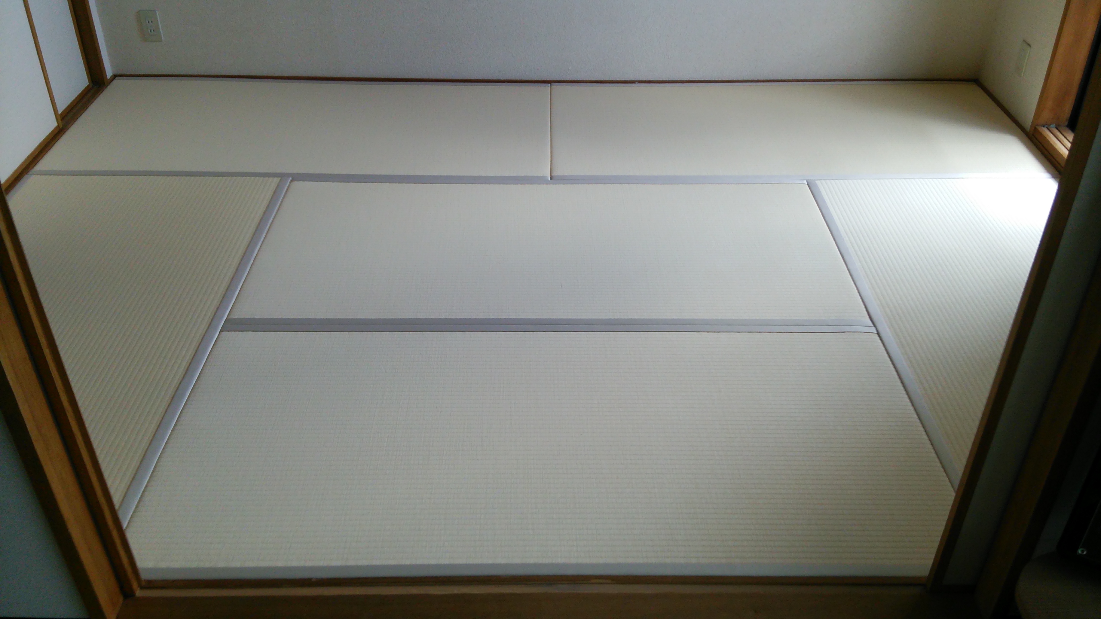 ダイケン和紙表「銀白カラー10(乳白色)」と同系色畳縁「ストリーム10(乳白色)」を使用して表替えさせて頂きました。