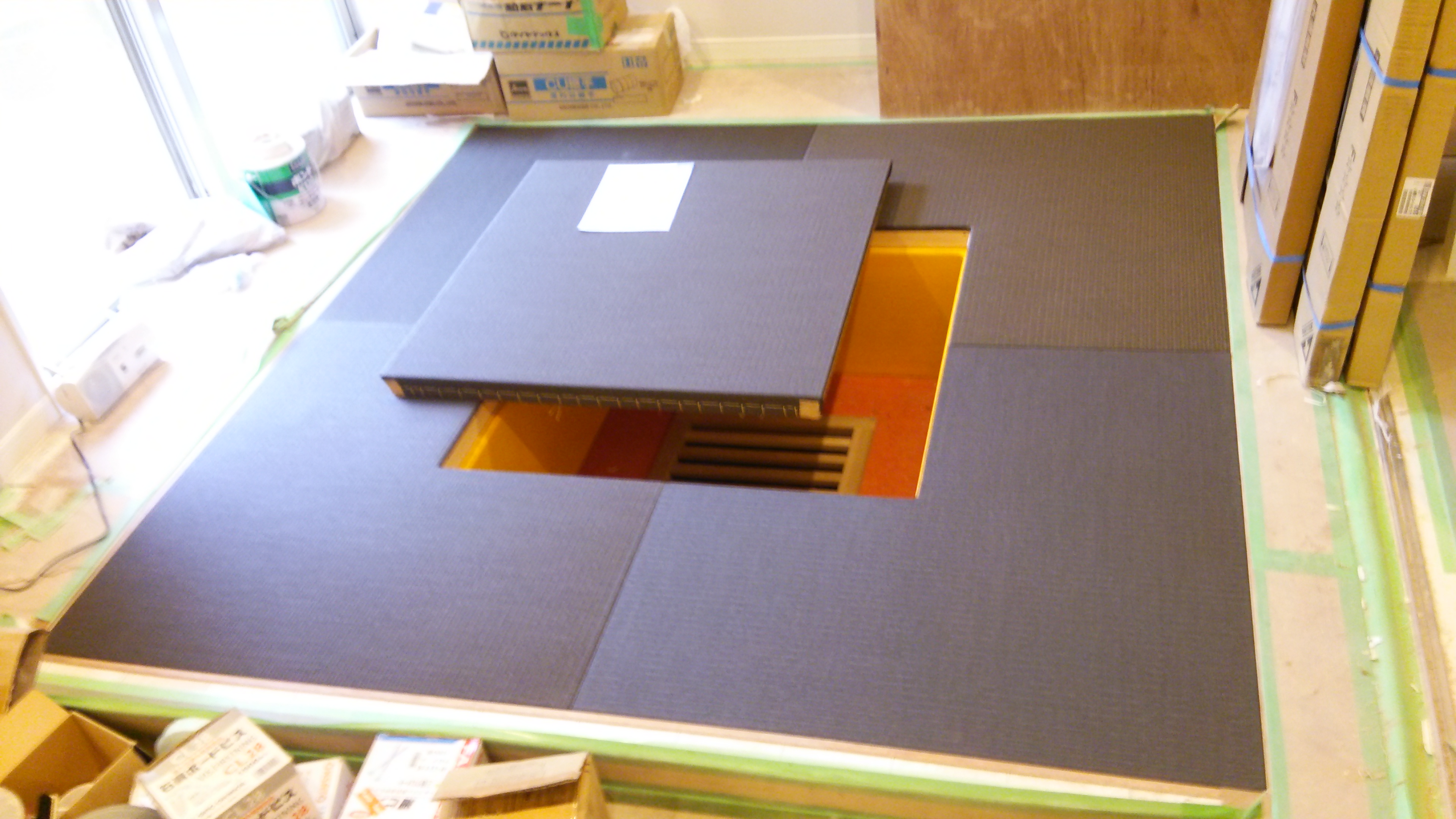2015/10/14 半畳4枚のお部屋で、真ん中に堀コタツを作ったので、周りの畳は全てL型(カギ型?)になりました。 ダイケン和紙表「清流12(栗色)」を使用して、15ミリの縁無畳(琉球畳)を作成しました。 すごく具合良く納められたので、嬉しかったです。 何度も作ってはいますが、縁無畳(琉球畳)で、L型、しかも部屋の端ではないので、作るのが大変でした。