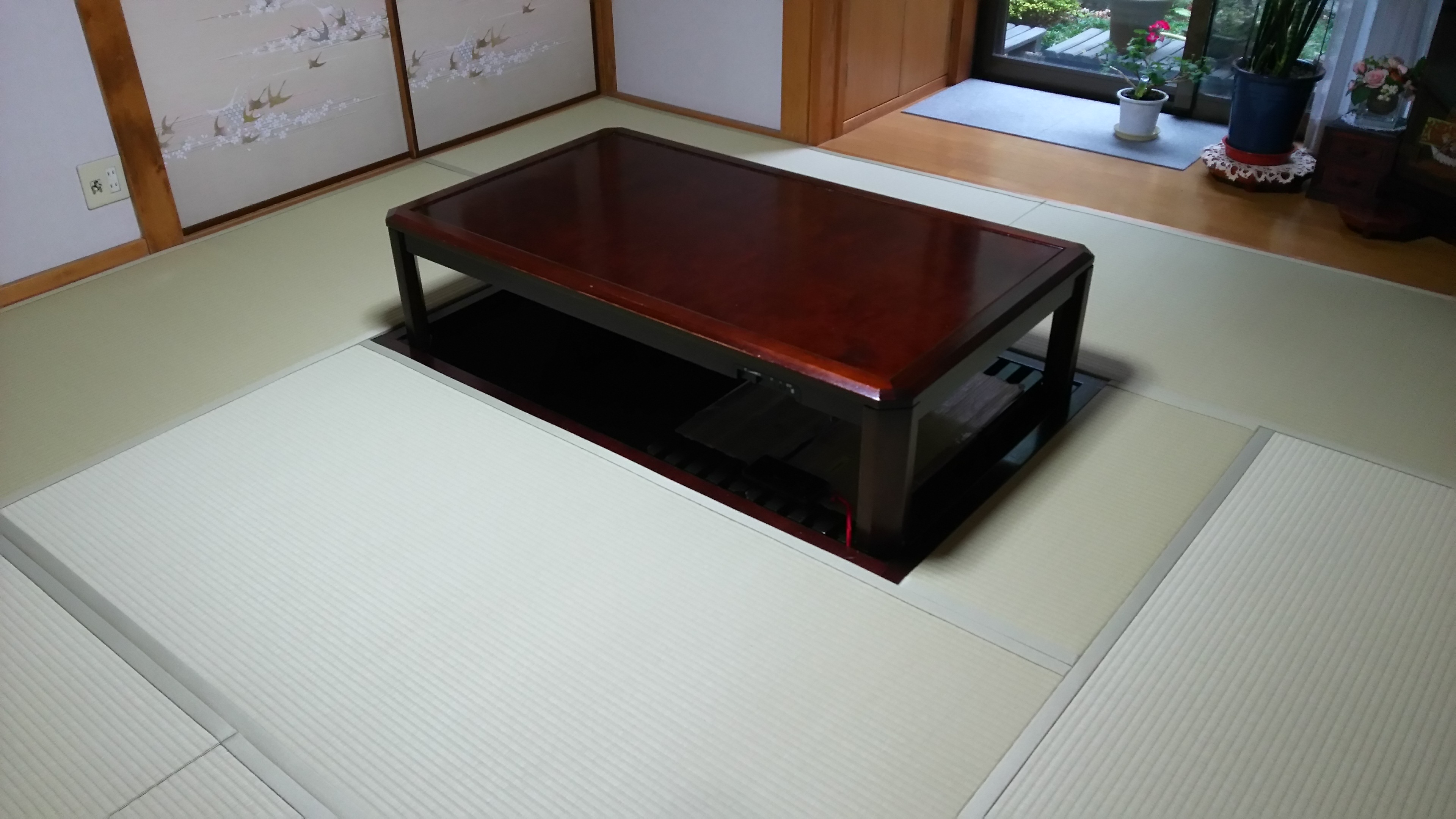 左の写真は、ダイケン和紙表「銀白19(胡桃色)」と畳縁「ストリーム19(胡桃色)」で表替えをさせて頂いたものです。