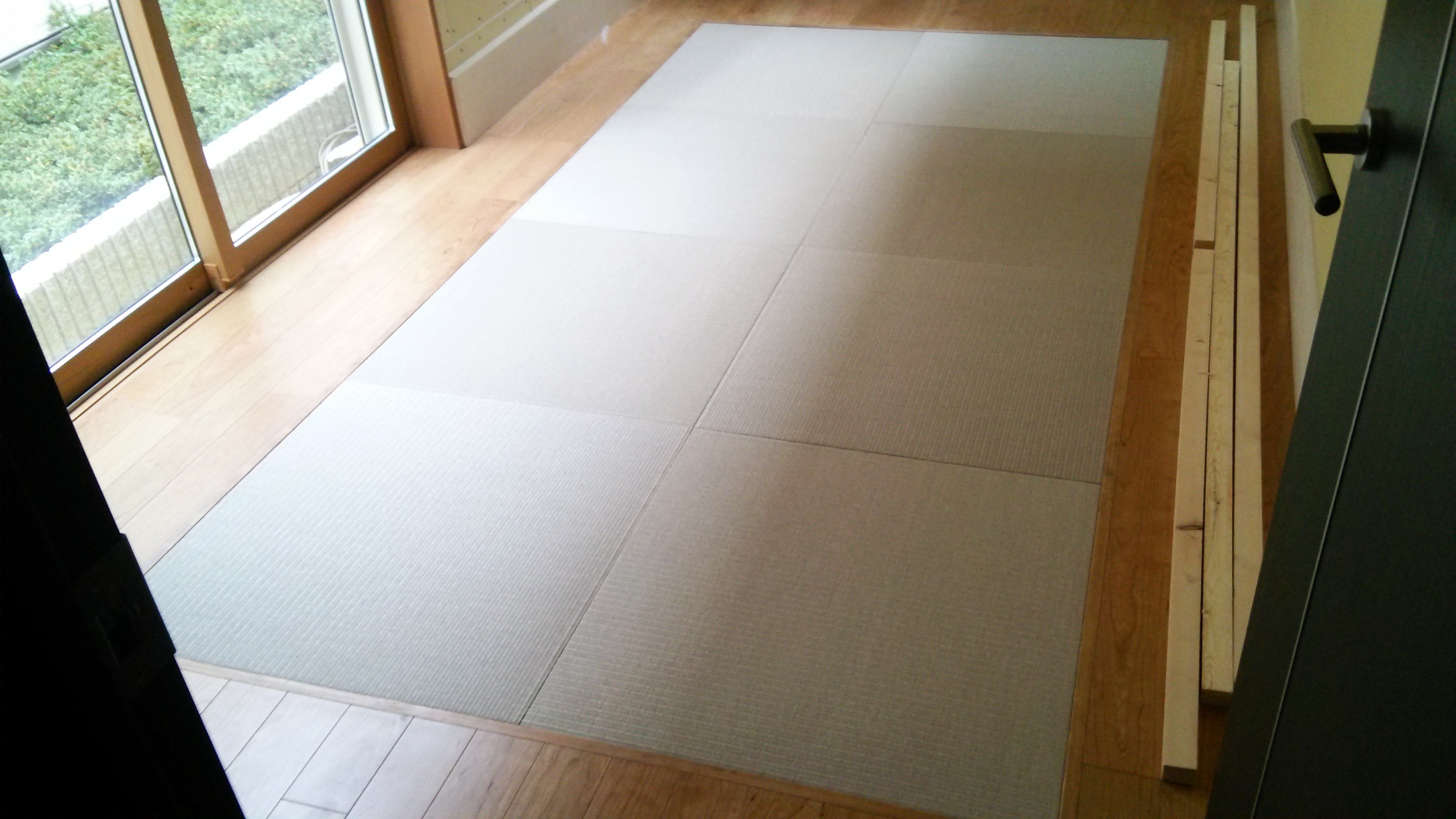 2015/12/22 ダイケン和紙表「清流14(灰桜色)」を使用して、縁無畳(琉球畳)半畳8枚を畳コーナーに敷き込みました。 弊社で、灰桜色は一番人気でして、とてもキレイな色です。 強く色が主張し過ぎないので、色々なタイプのお部屋に合うみたいです。 グリーン(銀白色)以外のカラーでは、一番数が出ています。