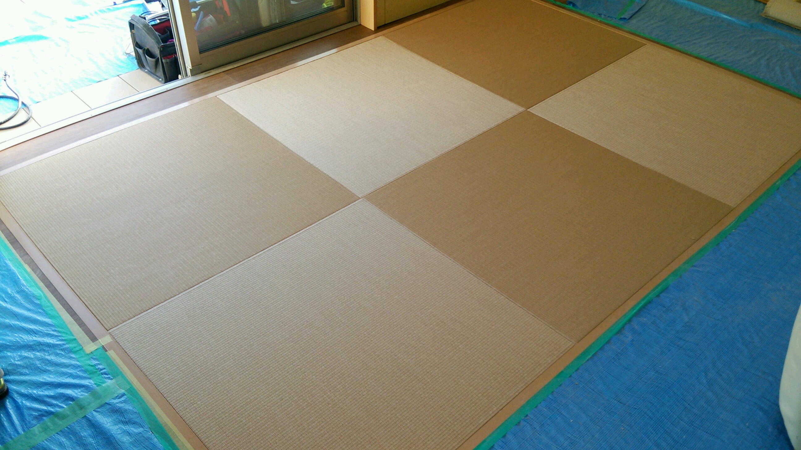 ダイケン和紙表「清流カクテルフィット13」を使用して、縁無畳(琉球畳)を半畳で6枚、市松敷きで納めてきました。
