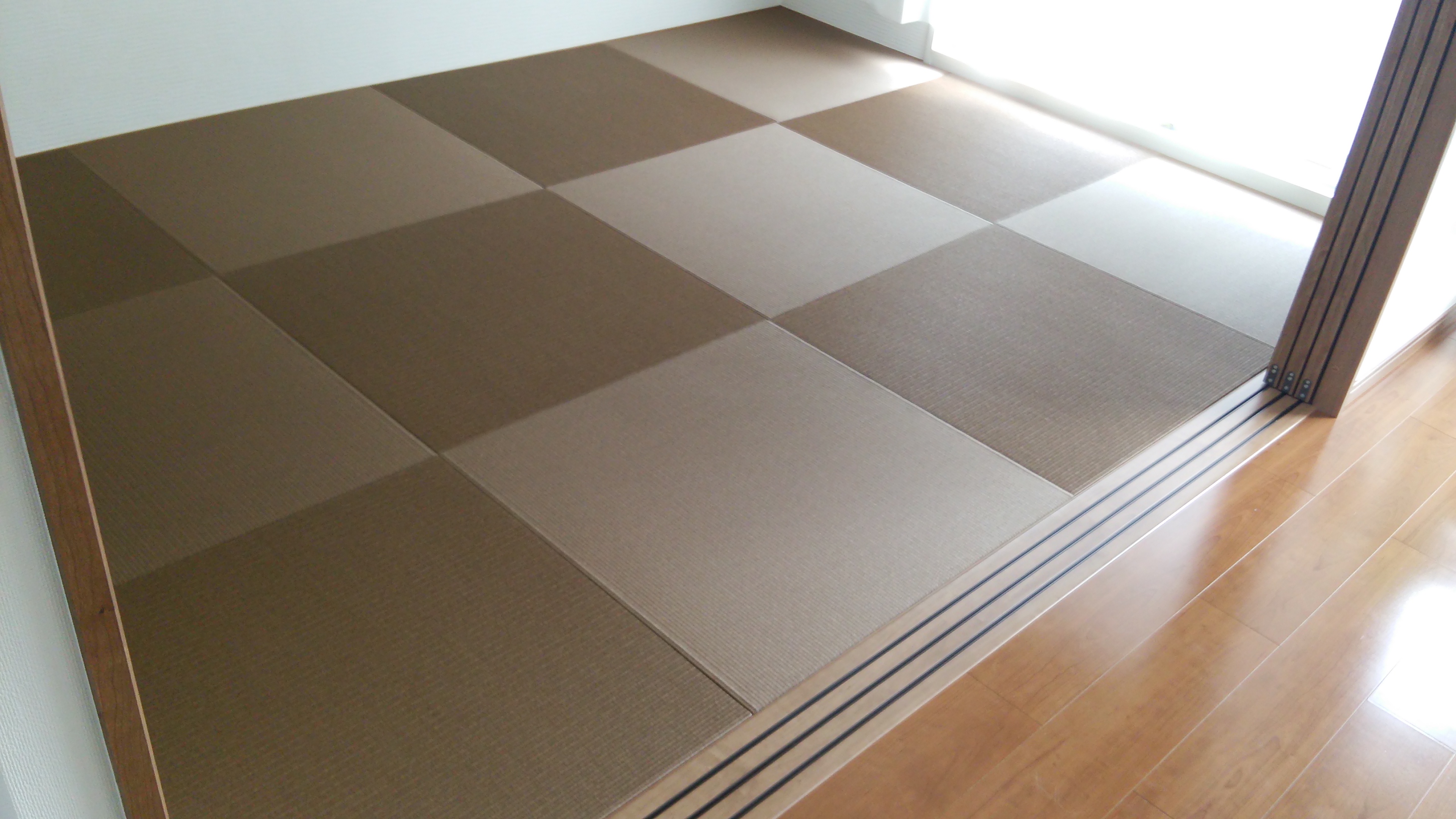 ダイケン和紙表「清流19(胡桃色)」を使用して、縁無畳(琉球畳)を半畳12枚、市松敷きで納品致しました。