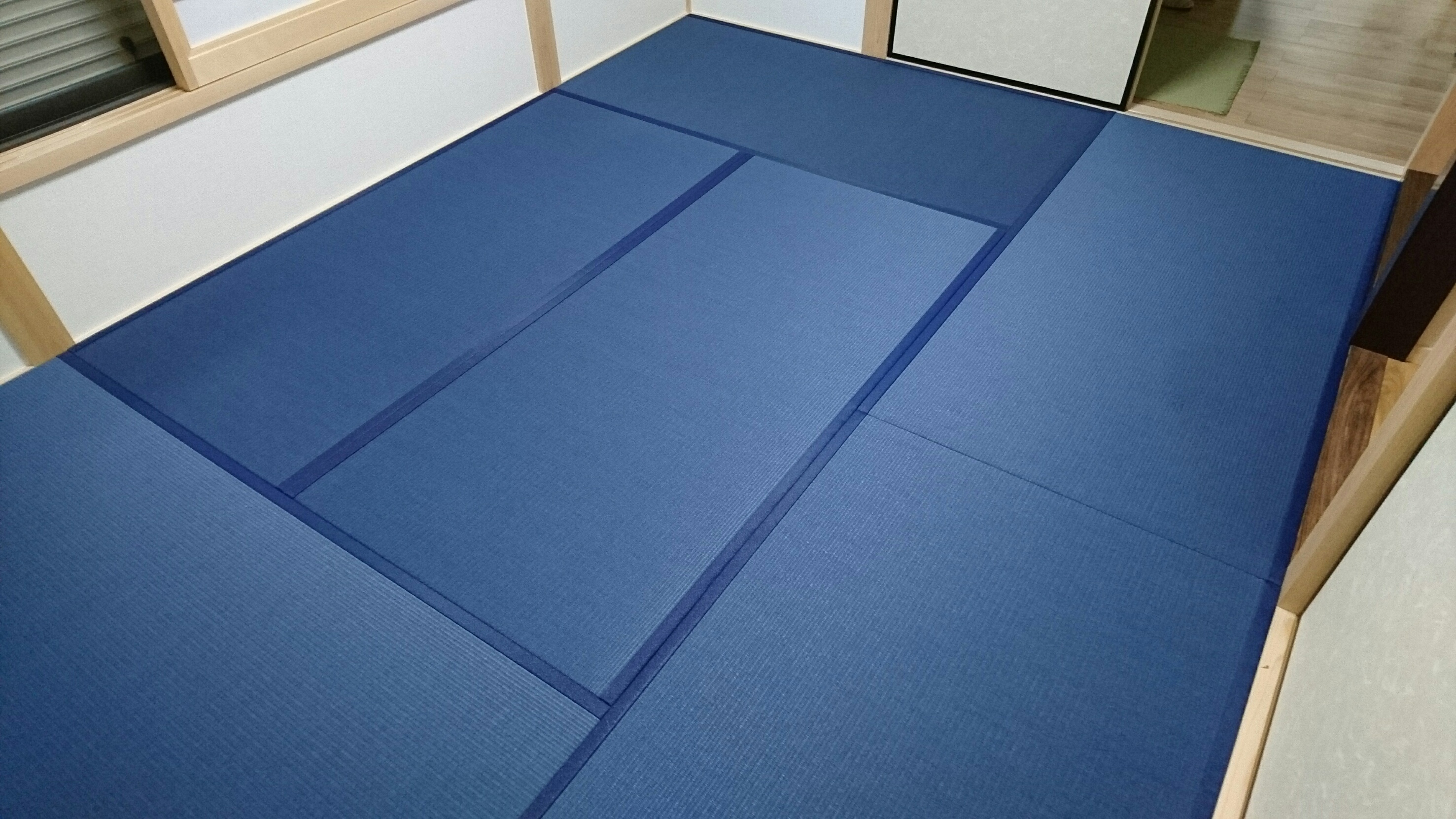 2016/11/01 ダイケン和紙表「清流17(藍色)」、ダイケン同系色畳縁「ストリーム17(藍色)」を使用して、縁付畳を納品致しました。 目が覚めるような青一色のお部屋になって、なかなかのインパクトでした。 少し前に納品した同じ「清流17(藍色)」の縁無畳(琉球畳)半畳9枚よりも広い為か、より「青(藍色)」の世界になっていました。