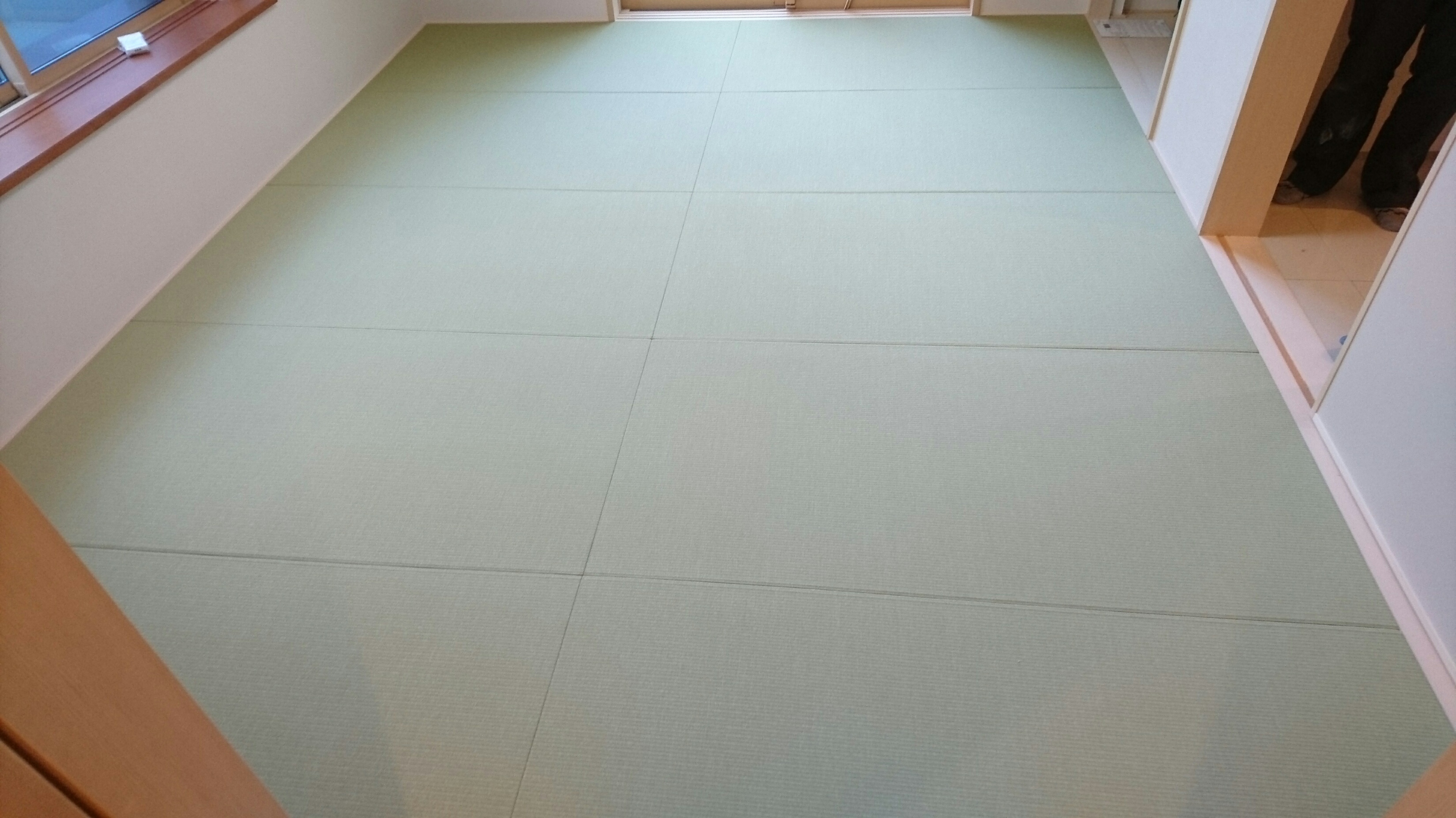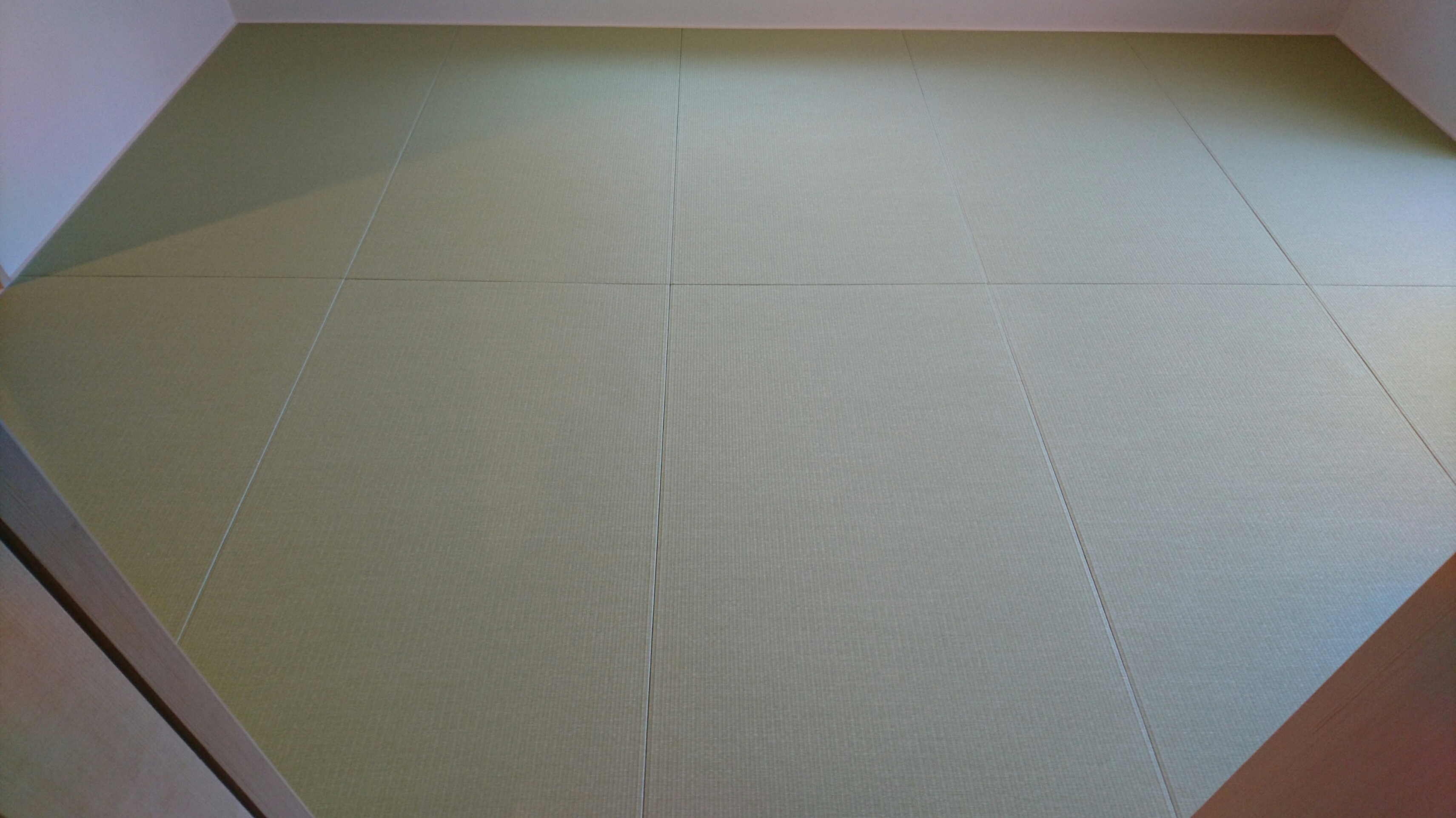 一帖タイプの縁無畳(琉球畳)で、畳縁が無いだけでも広く感じる上に、一色に仕上げたので、実際より相当広く見えていると思います。