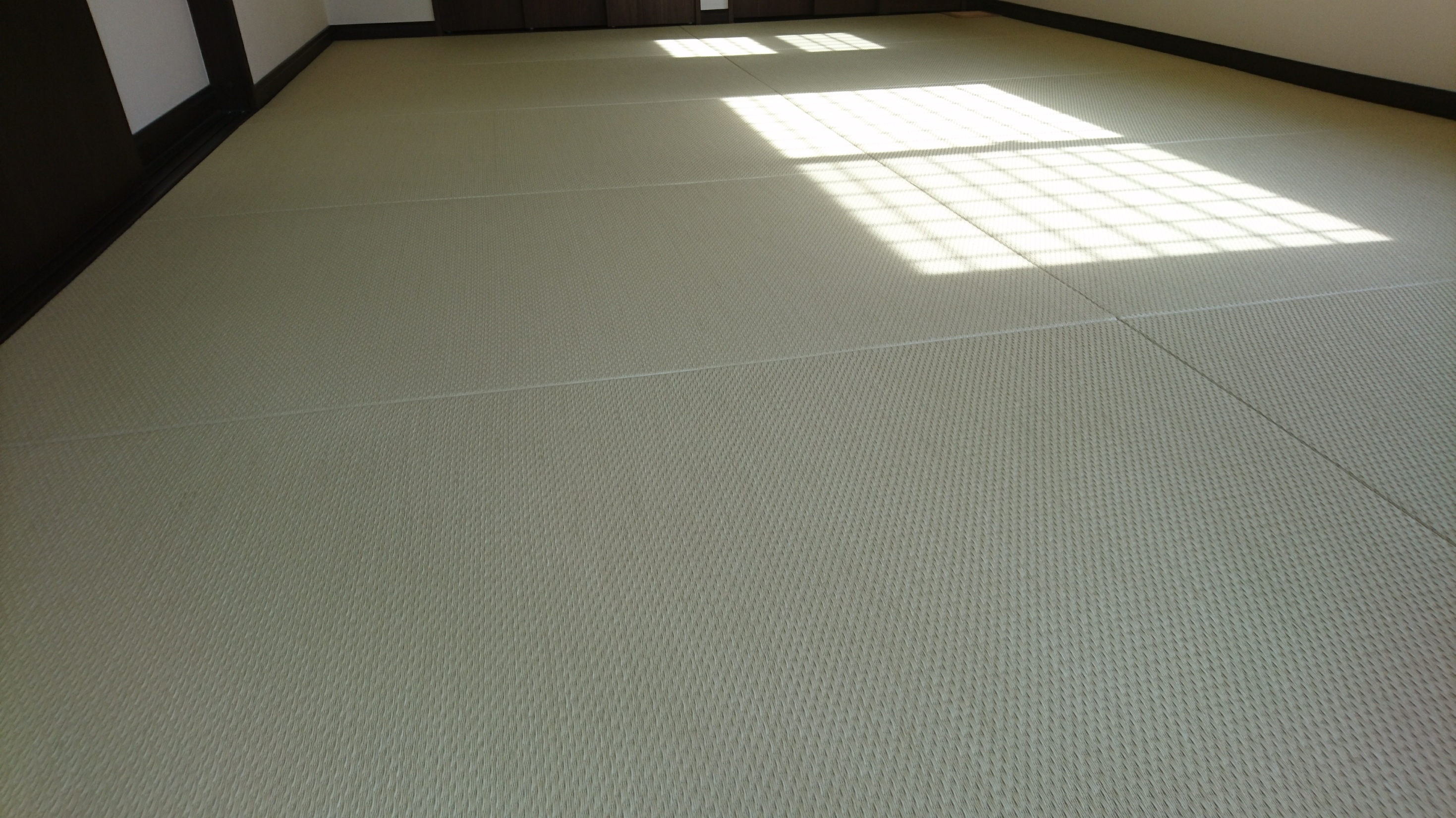 2018/04/04 ダイケン和紙表「小波(さざなみ)16(若草色)」を使用して、床暖対応15ミリの縁無畳(琉球畳)一帖タイプ10枚を作成・納品させて頂きました。 元々洋室だったお部屋に、ピッタリ納まる様に採寸して作らせて頂きました。 一般的な10帖間の畳の敷き方ではなく、全て同じ向きの大広間敷きにすることによって、スッキリ広く感じる仕上がりになっています。 小波シリーズを使うことで、洋室の雰囲気を活かしつつ、畳敷きの良さをお楽しみ頂けると思います。