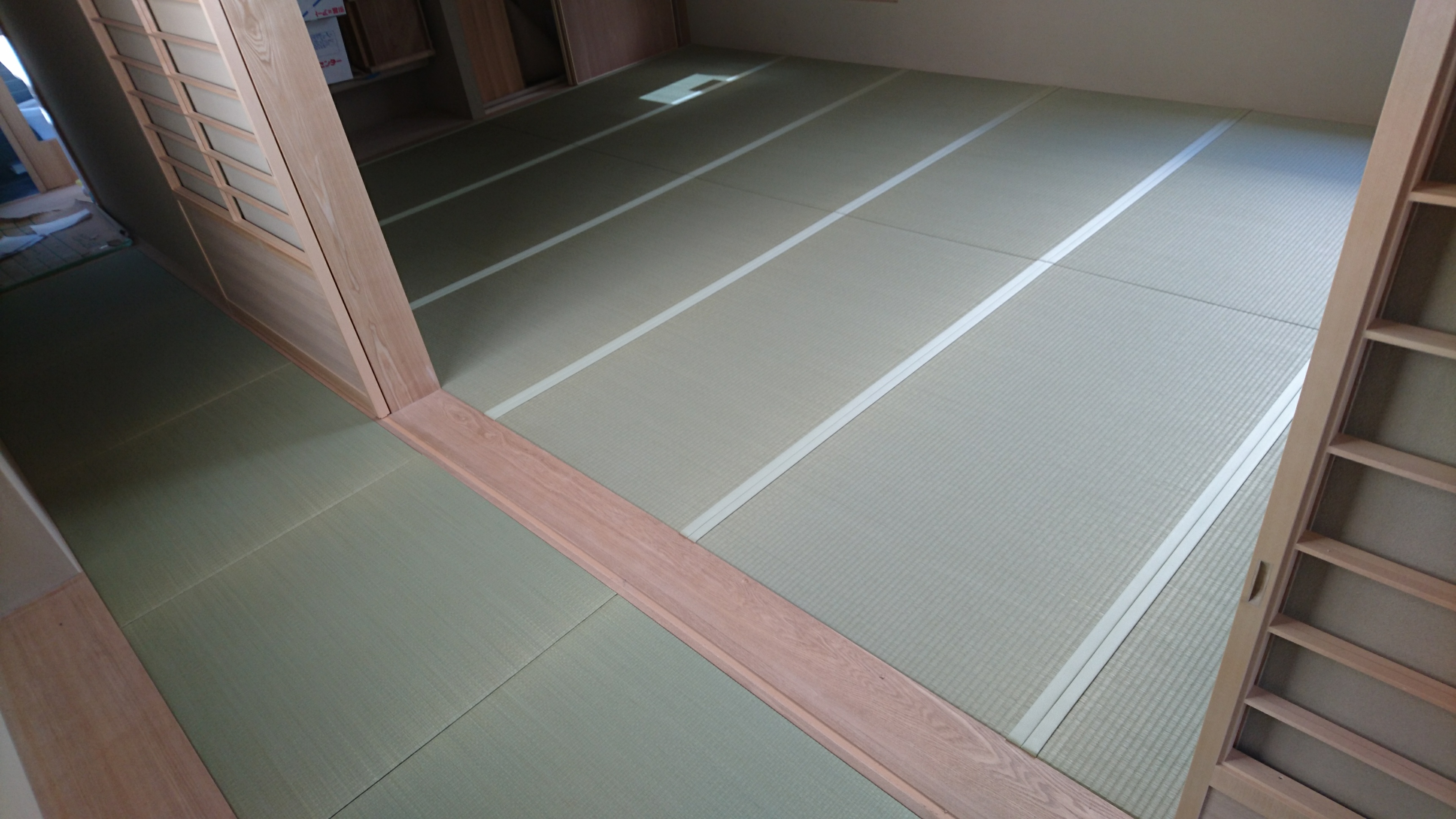 天然イ草表とダイケン畳床「座スリム15」を使用して、薄畳(15ミリ)の縁付畳を16帖、廊下に天然イ草表「目積表」とダイケン畳床「座スリム15」を使用して、縁無畳(琉球畳)半畳6枚を同じ向きで敷き込みました。