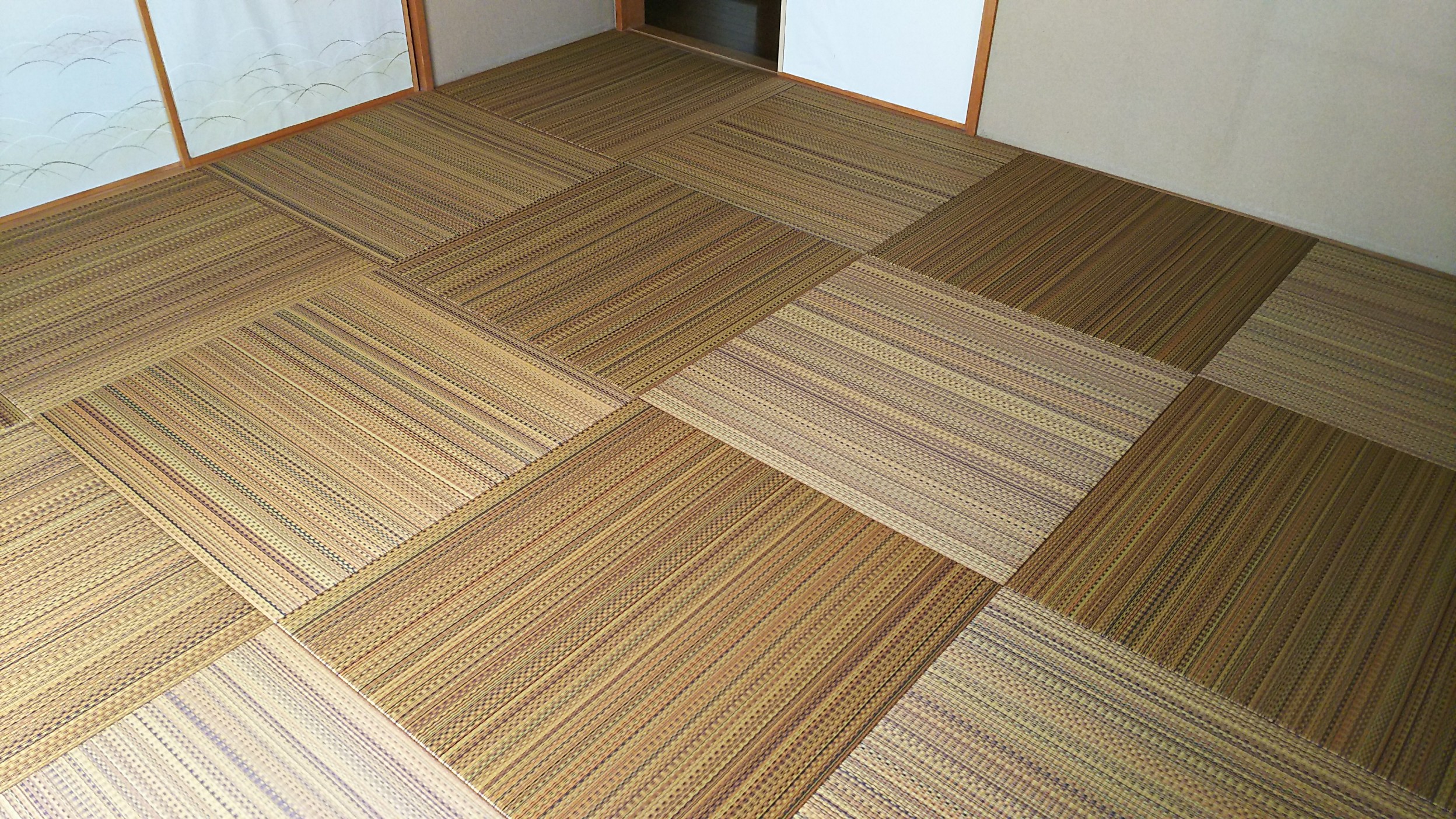 セキスイ美草「アースカラー コレクションNO.6(デザート)」を使用して、普通の8帖間を、縁無畳(琉球畳)半畳16枚に市松敷きで入替えさせて頂きました。