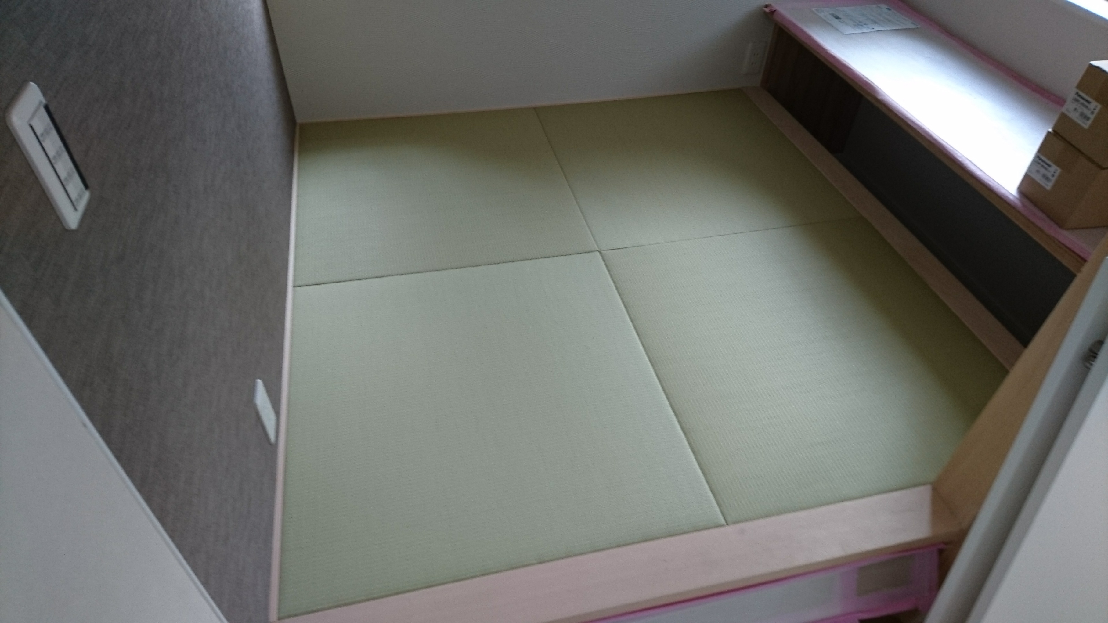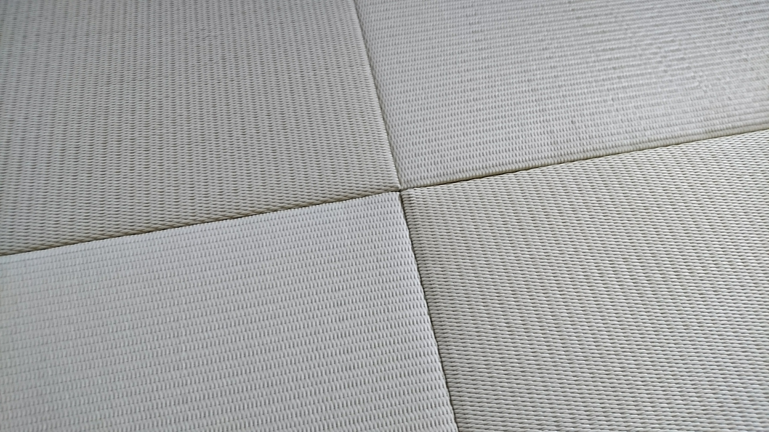 2018/06/12 ダイケン和紙表「彩園01(新銀白色)」を使用して、縁無畳(琉球畳)半畳4枚を市松敷きで納品致しました。 「彩園シリーズ」は、他の「清流シリーズ」や「綾波・小波シリーズ」に比べて厚みが薄く、クッション性が低い為、今回は畳表と畳床の間にクッション材を挟んで柔らかさを出してみました。 お客様からは「彩園01」縁無畳の指定しか御座いませんでしたが、より良いと思いそうさせて頂きました。 堅過ぎず、快適にご使用頂けていると思います。 現場:伊勢原市