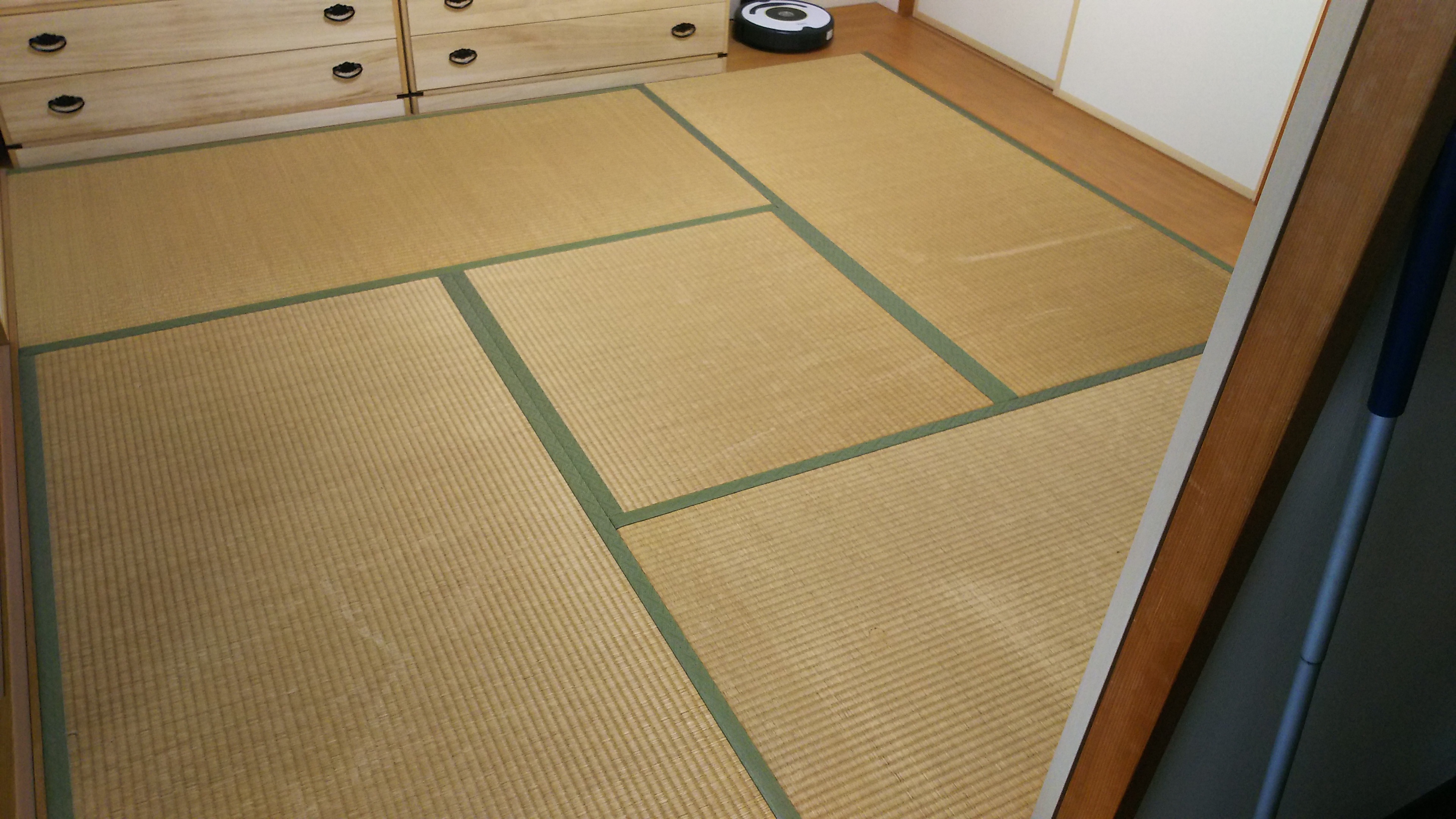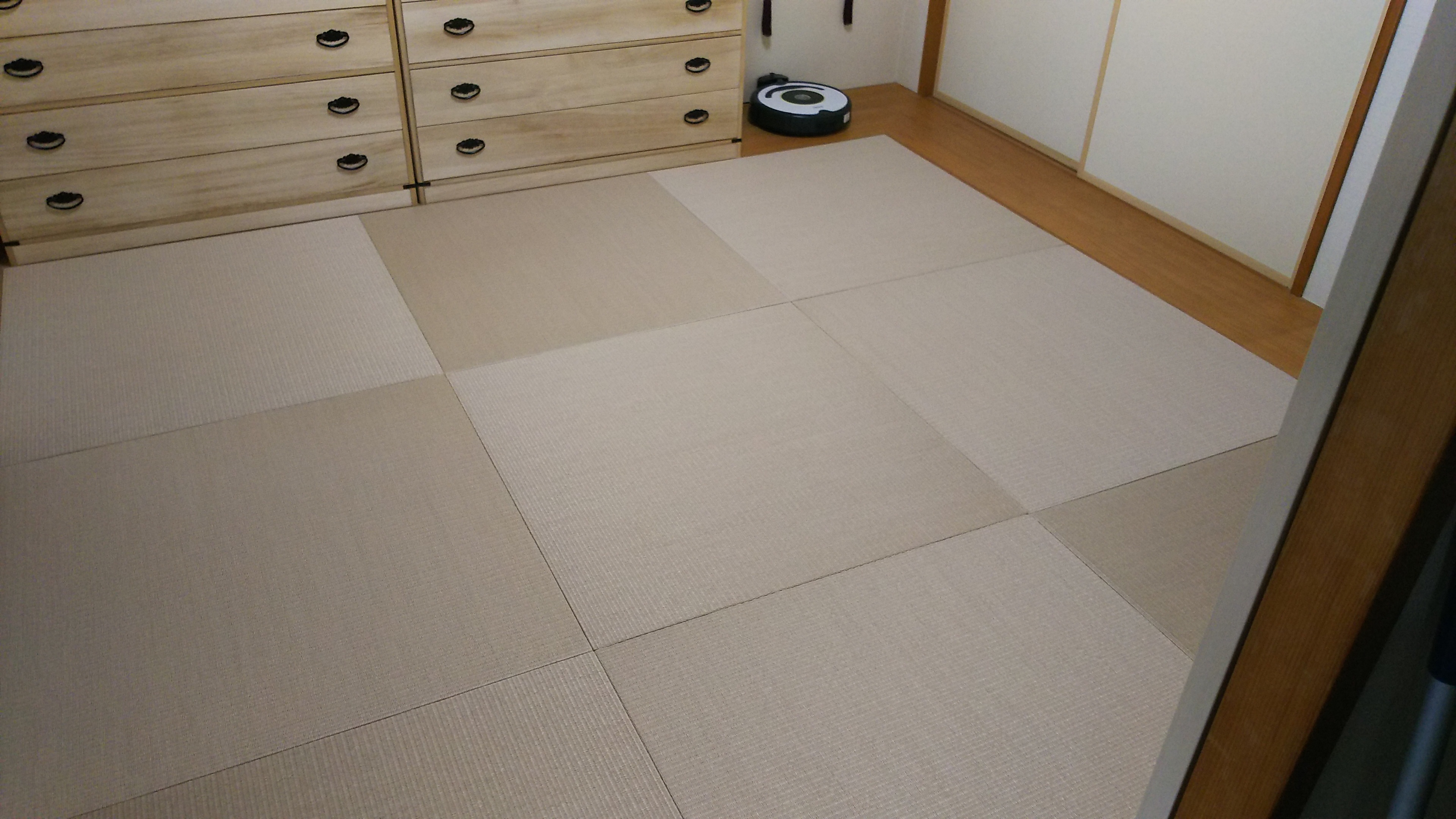 施工後ダイケン和紙表「清流カクテルフィット17(灰桜色×白茶色)」を使用して、縁無畳(琉球畳)半畳9枚に市松敷きで入れ替えさせて頂きました。